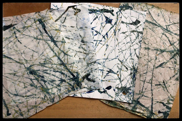 Great lesson in color mixing and endless fun! Every color possible (white 3 primaries, black, white, burnt sienna, and burnt umber) is represented here on several substrates: cheap drawing paper (again, Dollar Tree - how can I not buy 10 tablets @ $1.25 each?), deli paper, and tissue paper.